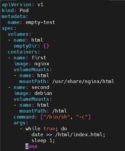 아래 yaml은 한 pod안에 2개의 컨테이너가 있고 2번째 컨테이너가 date를 index.html로 저장한다. 이렇게 저장된 정보를