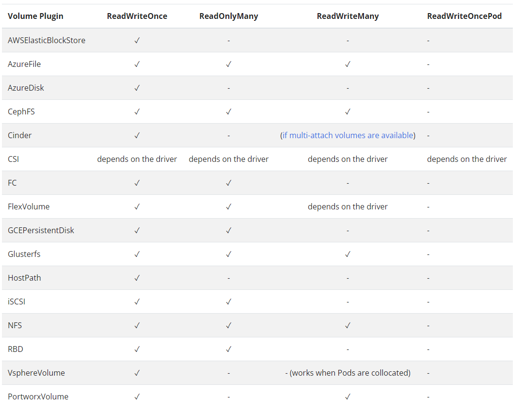지원가능한 스토리지 종류들에 대해서는 공홈에 나와있는 것처럼 아래 이미지와 같다. 또한 접근 정책에 대해서도 나와있다.