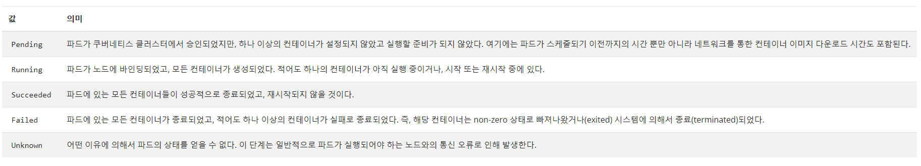 파드는 컨테이너를 실행하기 위한 최소 단위이다. 파드는 한개 혹은 여러개의 컨테이너를 담을 수 있다.